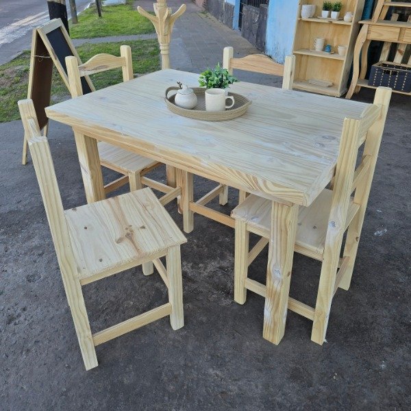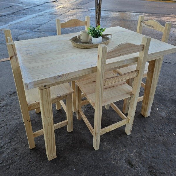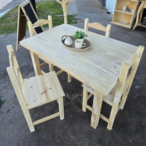 Mesa Eco de 1,20 m x 70 cm con patas reforzadas 3x3 cm y 4 sillas de diseño clásico y robusto. Ideal para espacios pequeños sin perder elegancia ni calidad.